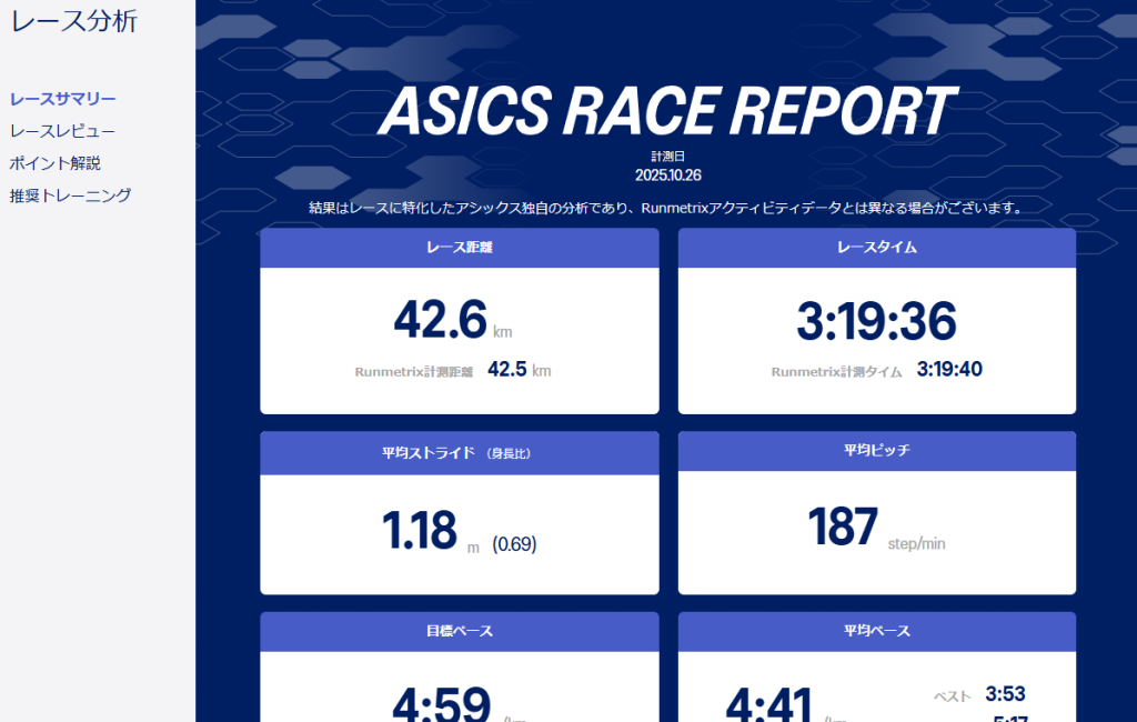 初めてレースレポートをまともにやってみましたが、基本的にRunmetrixが提供しているデータを下に作っているので普段からアプリで見ている内容。