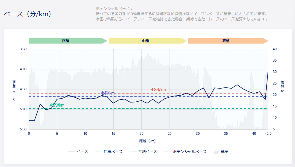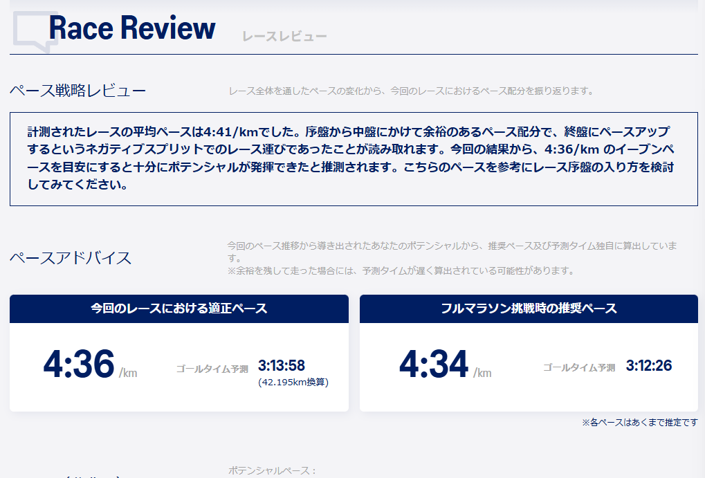 純粋にデータから読み取った内容となるので、今回のレース運びという点では分析されたようにネガティブスプリットですね。