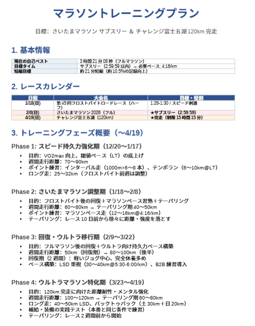 これから先のマラソン大会へ出場するに当たってのトレーニングプランを考えたいです。 ・自己ベスト:3時間21分08秒(フルマラソン) ・これからの出場レース:2026年 1月18日第45回フロストバイトロードレース (大会詳細)、2026年 2月8日さいたまマラソン2026 (大会詳細) 、 2026年4月19日チャレンジ富士五湖(120km) ・ロング走をする曜日:土曜日か日曜日 目標:さいたまマラソンでサブスリー。チャレンジ富士五湖は120km完走