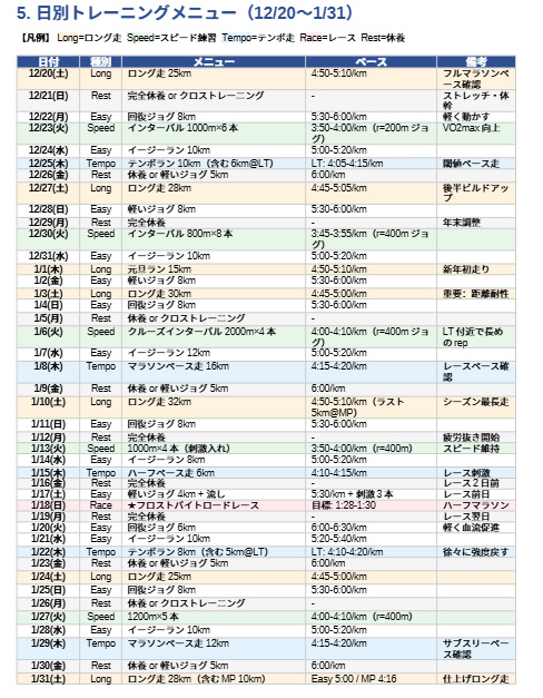 この目標を達成する上で必要となるトレーニングのチャレンジ富士五湖までの大まかな概要と1月末までの日別のトレーニングメニューを作成してください