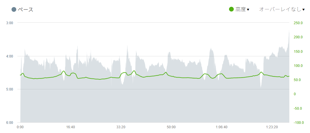そんなこんなで起伏のあるコースに対してのペースですが、当然のように下り坂ではペースが上がり、登り坂では下がります。