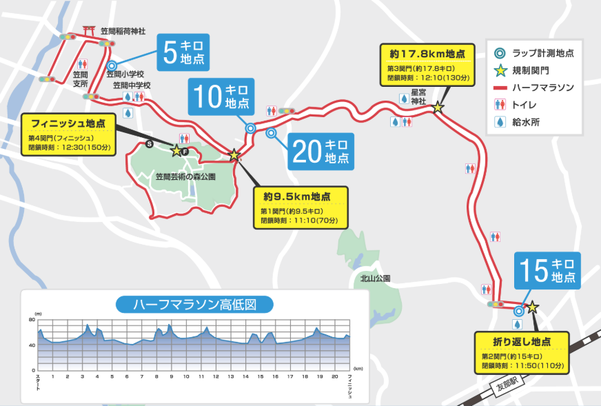 コースの難易度が特別高いというわけではないと思いますが、ハーフマラソンという点を考えるとそれなりに起伏の富んだコースと言えるのではないかと思います。