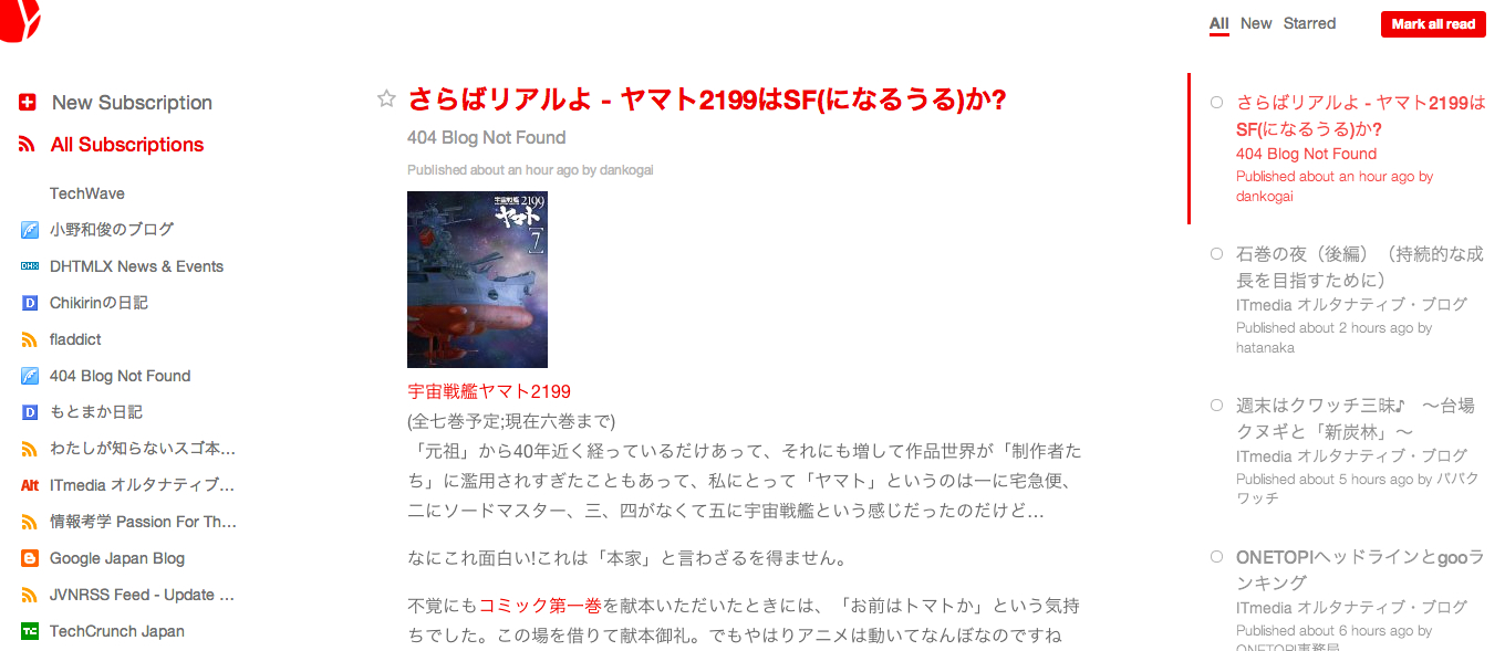 私はというと、今は Yoleo Reader というRSSリーダーを利用しています